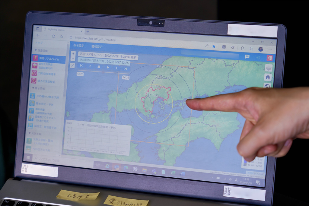 2. 警告灯の点灯かアラームを確認した班員が「落雷リアルタイム」画面で監視を開始。