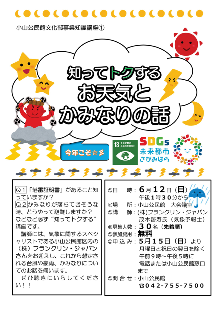 2022年6月12日に小山公民館(神奈川県相模原市) 文化部主催の講座「知ってトクするお天気とかみなりの話」で当社気象予報士が講演をいたします。