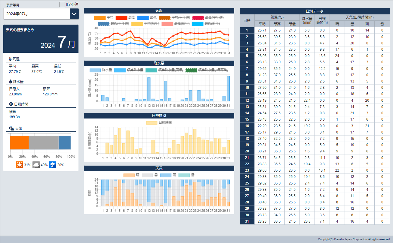 要素は、気温・降水量・日照時間・天気の4種類。データは、毎日自動更新され、過去5年分の閲覧が可能です。