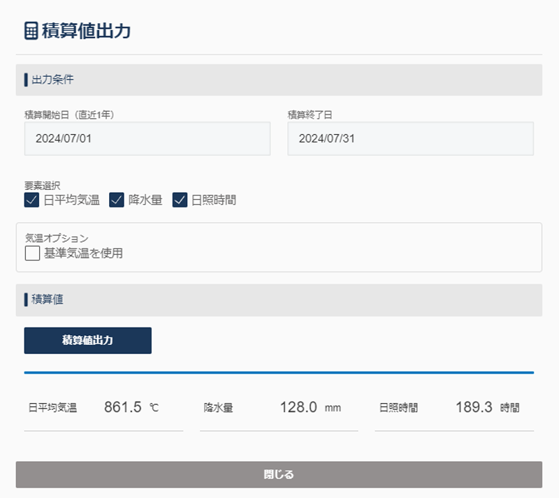 任意期間の「日平均気温」「降水量」「日照時間」の積算値を自動で計算します。