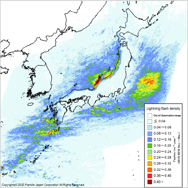 2011年~2020年の冬季(11月~3月)に、全国雷観測ネットワーク「JLDN」で観測されたデータをもとに作成した落雷密度マップです。 日本列島を一辺10㎞のメッシュで区切り、メッシュ内の落雷発生数を、冬季(11月~3月)10年間の年平均値で表しています。