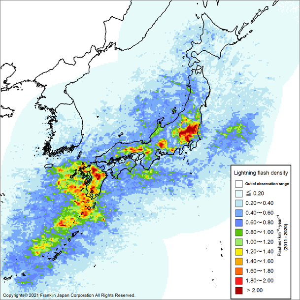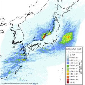 ※「JLDN」は、雷観測装置から求めた落雷密度に関する国際規格であるIEC62858を日本で唯一満たしている雷観測ネットワークです。この国際規格から、JLDNは日本と周辺部において、10㎞×10㎞のメッシュで大地落雷密度を求めることができることを確認しています。