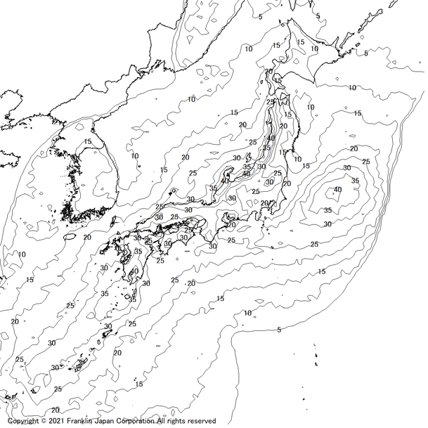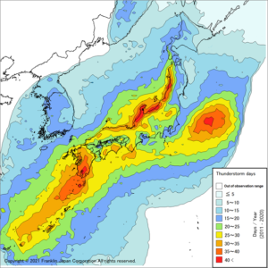 2011年~2020年の10年間に、全国雷観測ネットワーク「JLDN」で観測されたデータをもとに作成した落雷日数マップです。気象庁の雷雨日数マップ(1954年~1963年の10年間)が緯度経度15分毎(日本付近では大体25㎞×27.5㎞)で雷雨日数を求めていたことから、日本列島を一辺25㎞のメッシュで区切り、メッシュ内の落雷日数を10年間の年平均値で表した図を基に、等値線を引いています。