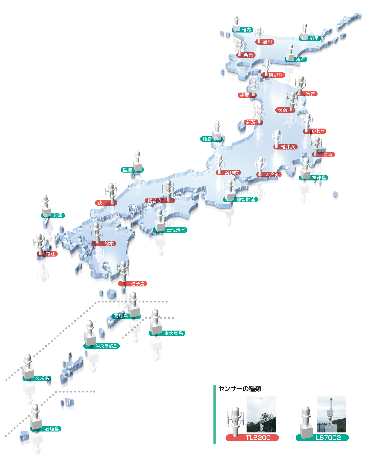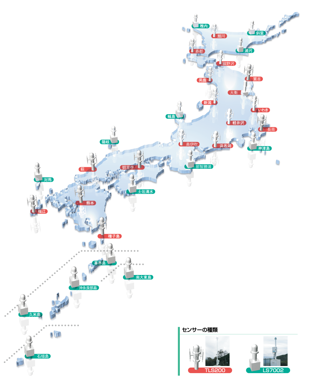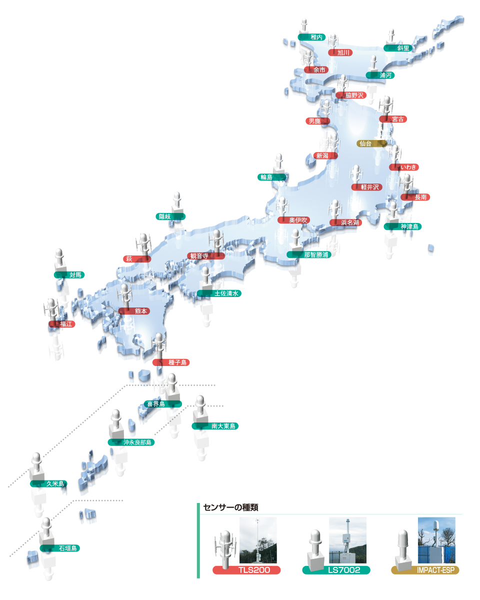 JLDN(Japanese Lightning Detection Network)は、フランクリン・ジャパンが運用する全国雷観測ネットワークです。 北海道から沖縄まで31基のセンサーにより構成され、日本全国をシームレスにカバーした観測網となっています。 JLDNの雷位置標定精度は、位置誤差300m以下となっており、NALDN(北米)やEUCLID(欧州)などの大規模雷観測ネットワークとほぼ同等の精度を有しています。