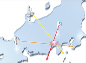 雷が放出した電磁波をセンサーで検出し、その到達方位(MDF:Magnetic Direction Finder/磁界方位検知)と、センサー間の電磁波の到達時間差(TOA:Time Of Arrival/到達時間差)を求めて、落雷位置を算出します。 到達時間差を求める時刻同期源にはGPSを用いて、高精度の位置標定を実現しています。