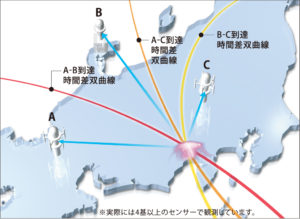 各センサーに到達した信号の誤差を測定し、その時間差から距離の差に換算し、 距離の差が一定となる軌跡を求めると双曲線が描かれます。同様に別のセンサー からも双曲線が描かれ、それらの交点から最適な地点を標定点とします。