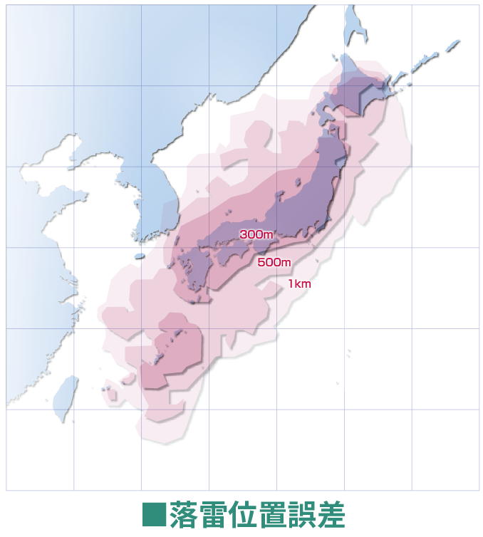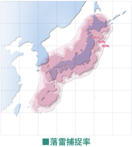 JLDNの検知効率と位置標定精度は、日本陸域の大部分をカバーしており「捕捉率90%以上」、「位置誤差300m以下」の高精度を保持しています。