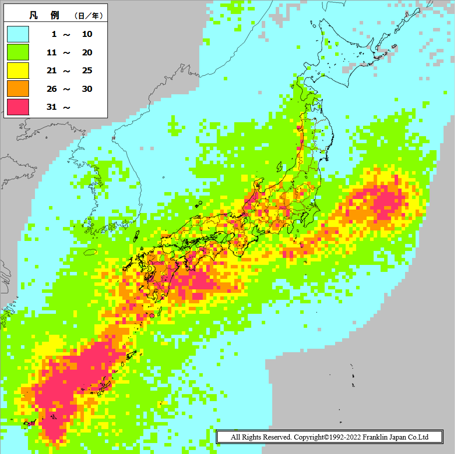 調査期間:2019年 単位:日/年 メッシュサイズ:20km四方
