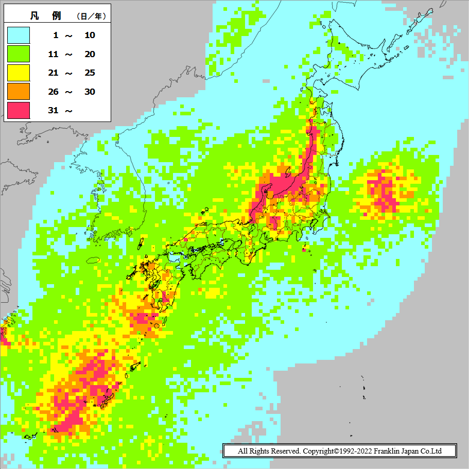 調査期間:2021年 単位:日/年 メッシュサイズ:20km四方