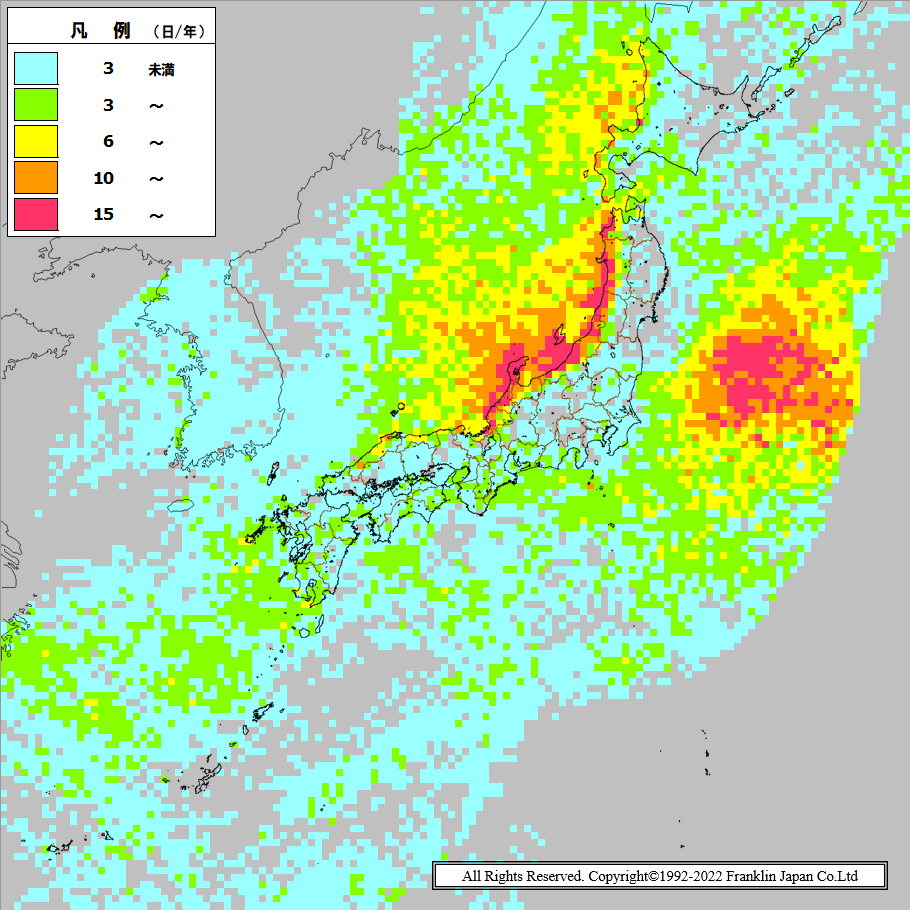 図は、日本列島を一辺20kmのメッシュで区切り、2020年10月~2021年3月にメッシュ内で観測された落雷数により、色分けしたものです。色分けの区分は、最近10年間で集計した年平均値により作成しています。