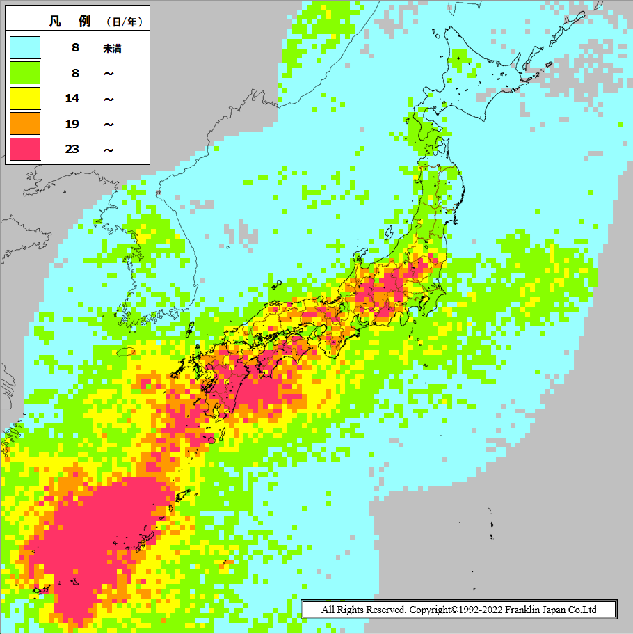 調査期間:2019年(4月~9月) 単位:日/年 メッシュサイズ:20km四方