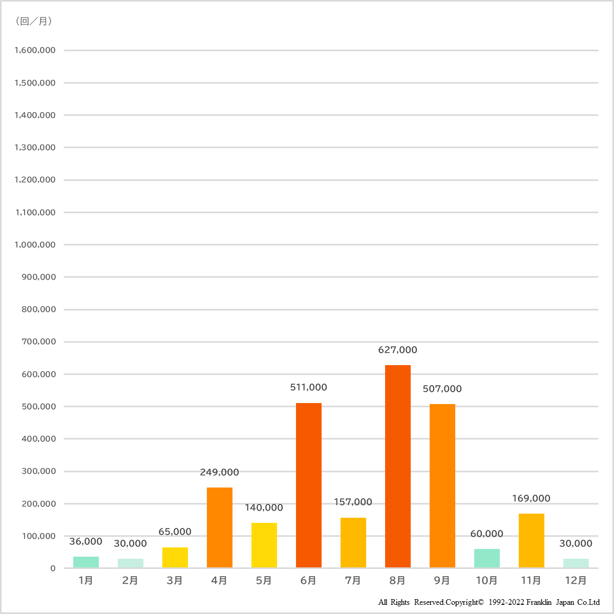 6月、8月を中心に夏季は多く、2月、12月を中心に冬季は少ない傾向にあります。