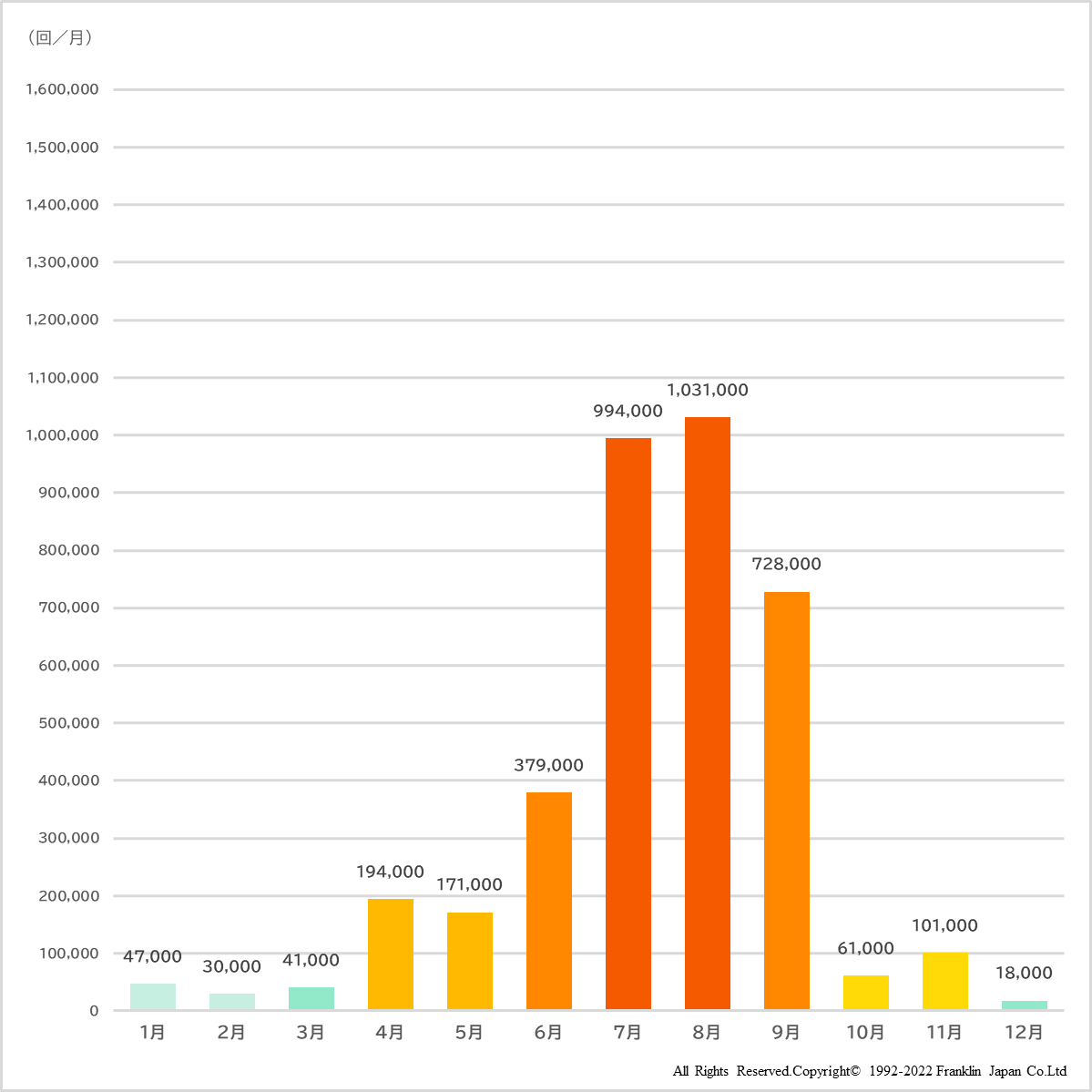 7月、8月を中心に夏季は多く、2月、12月を中心に冬季は少ない傾向にあります。
