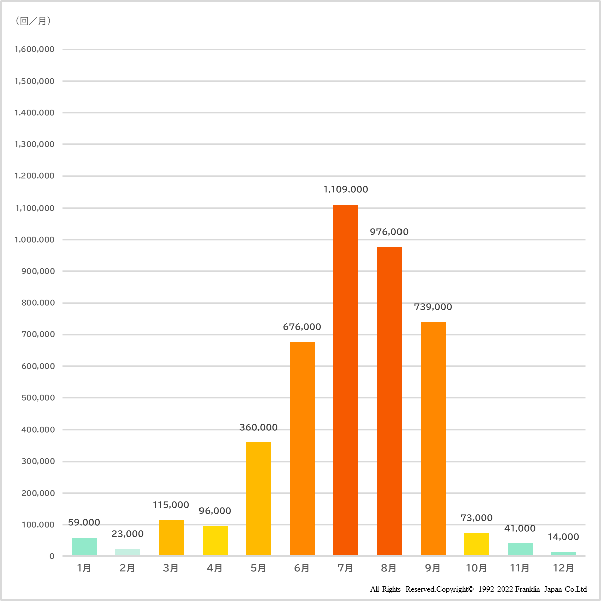 7月、8月を中心に夏季は多く、2月、12月を中心に冬季は少ない傾向にあります。