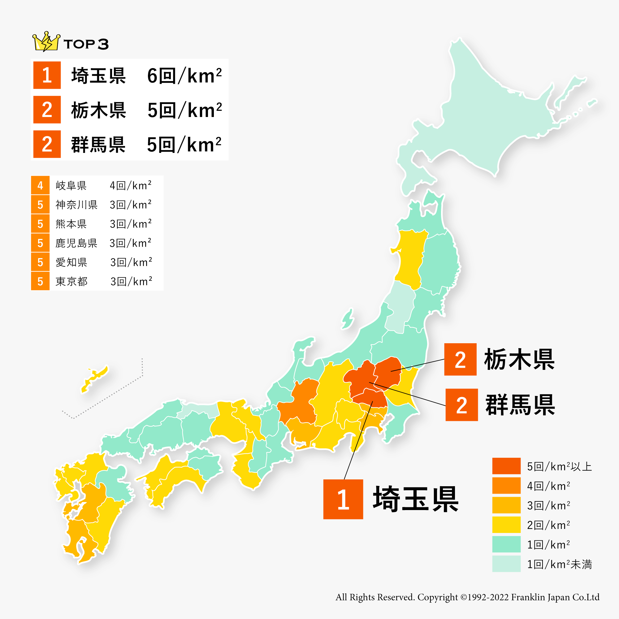 落雷密度は、各都道府県の落雷数を面積で割った、単位面積(1平方キロメートル)あたりの落雷数になります。