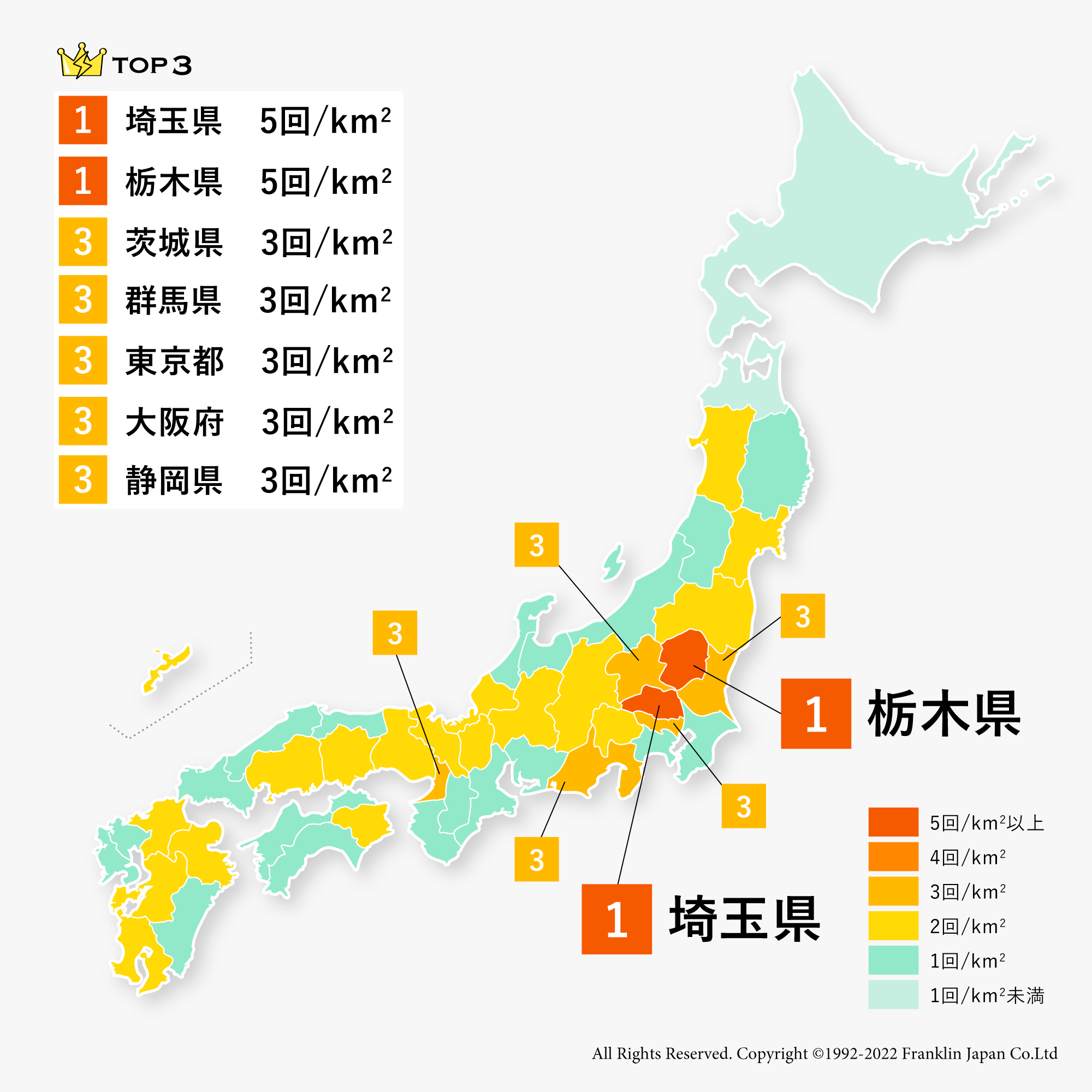 3位は3回/km2の茨城県、群馬県、東京都、大阪府、静岡県でした。