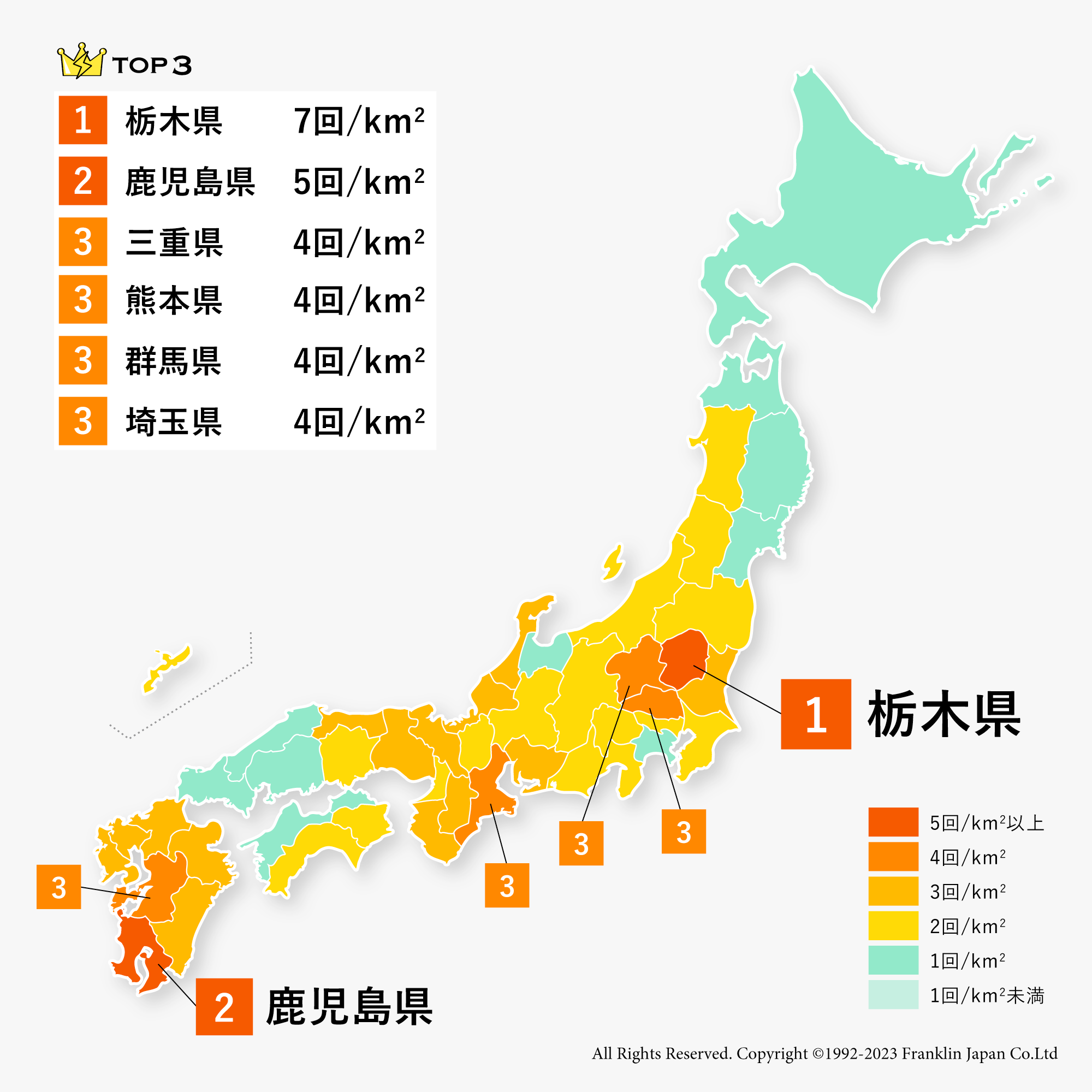 2位は5回/km2の鹿児島県。3位は4回/km2の三重県、熊本県、群馬県、埼玉県でした。