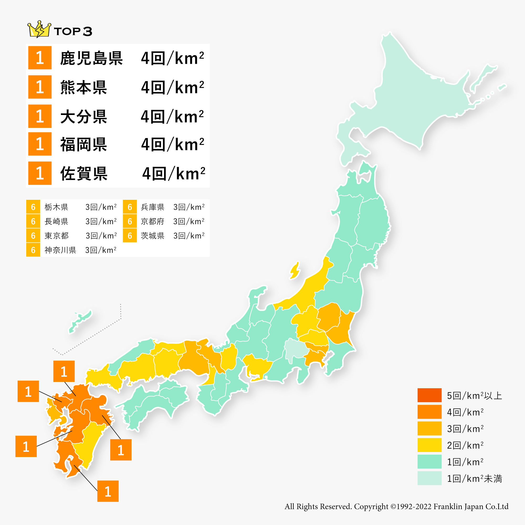 2017年は、鹿児島県、熊本県、大分県、福岡県、佐賀県が4回/km2で1位になりました。