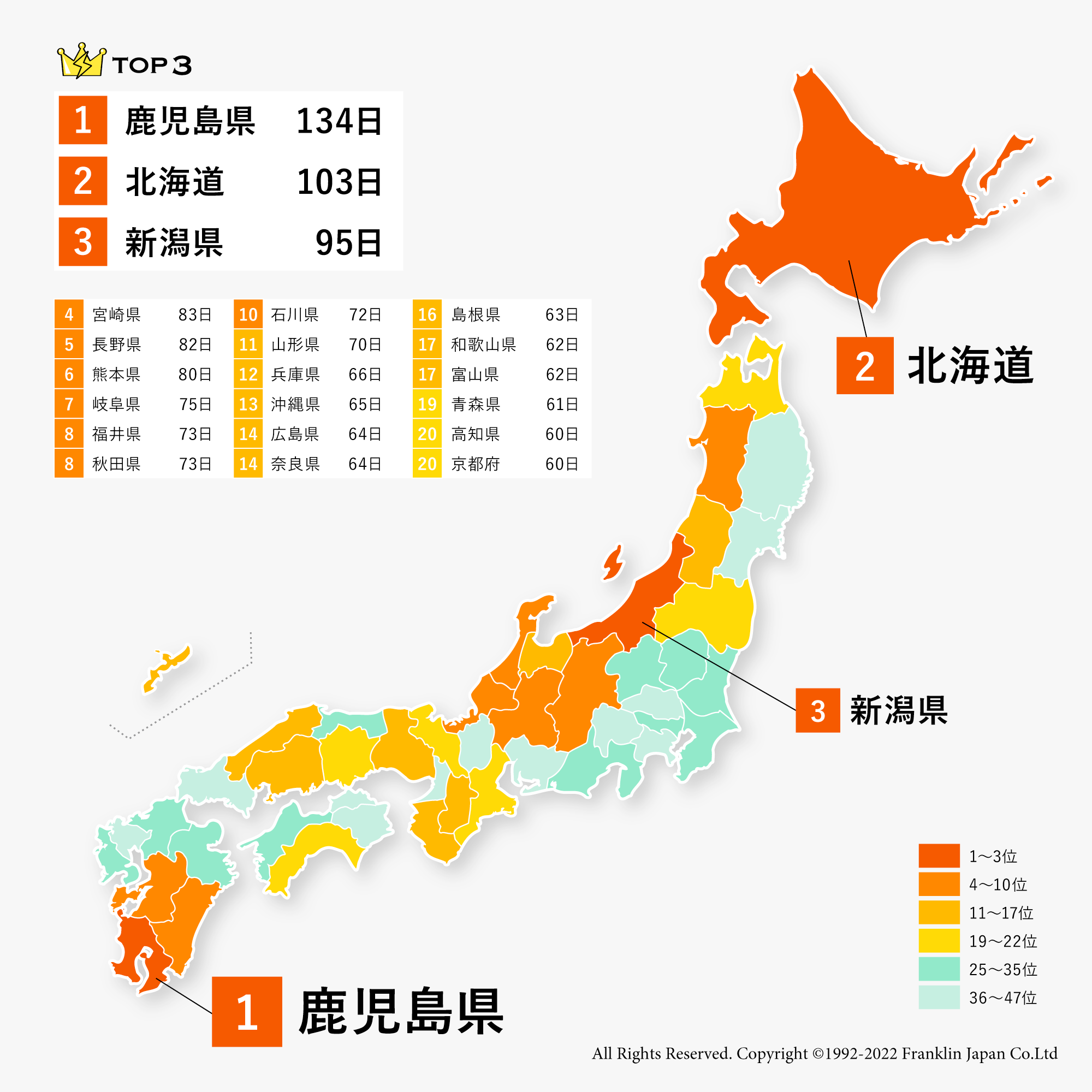 2位は103日で北海道、3位は95日で新潟県となりました。