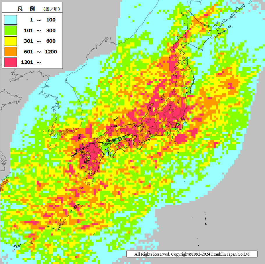図は、日本列島を一辺20kmのメッシュで区切り、2023年にメッシュ内で観測された落雷数により、色分けしたものです。色分けの区分は、最近10年間で集計した年平均値により作成しています。 最近10年平均値と比較すると、北海道から九州の広い範囲で落雷が多くなっています。