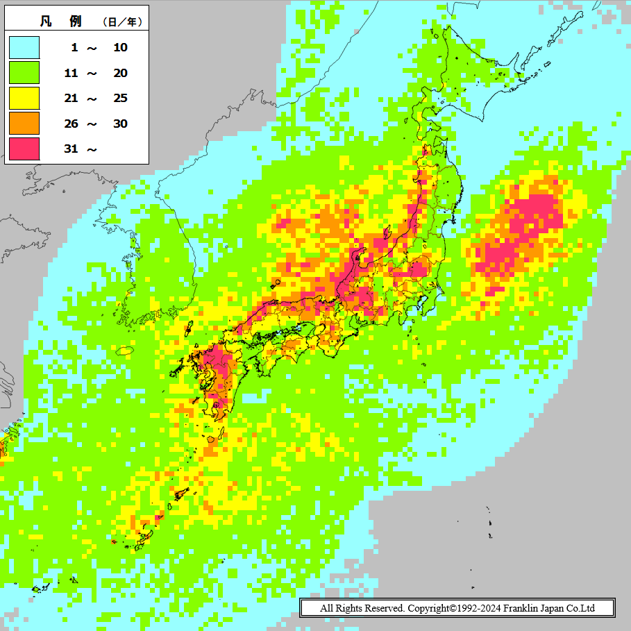 調査期間:2023年 単位:日/年 メッシュサイズ:20km四方
