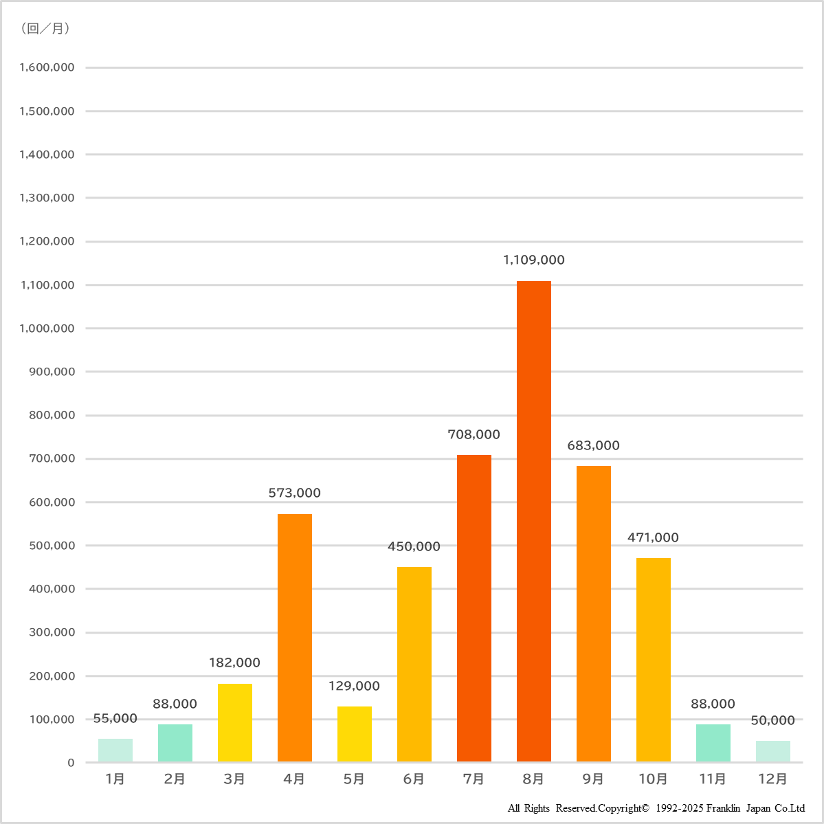 7月、8月を中心に夏季は多く、1月、2月を中心に冬季は少ない傾向にあります。