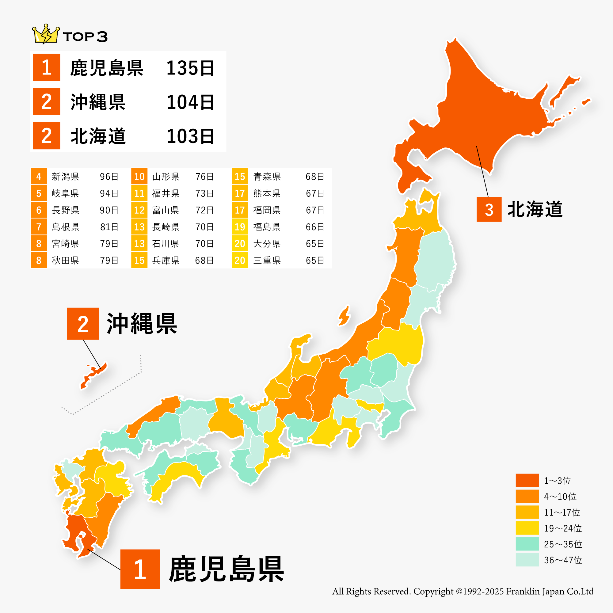 2位は104日で沖縄県、3位は103日で北海道となりました。