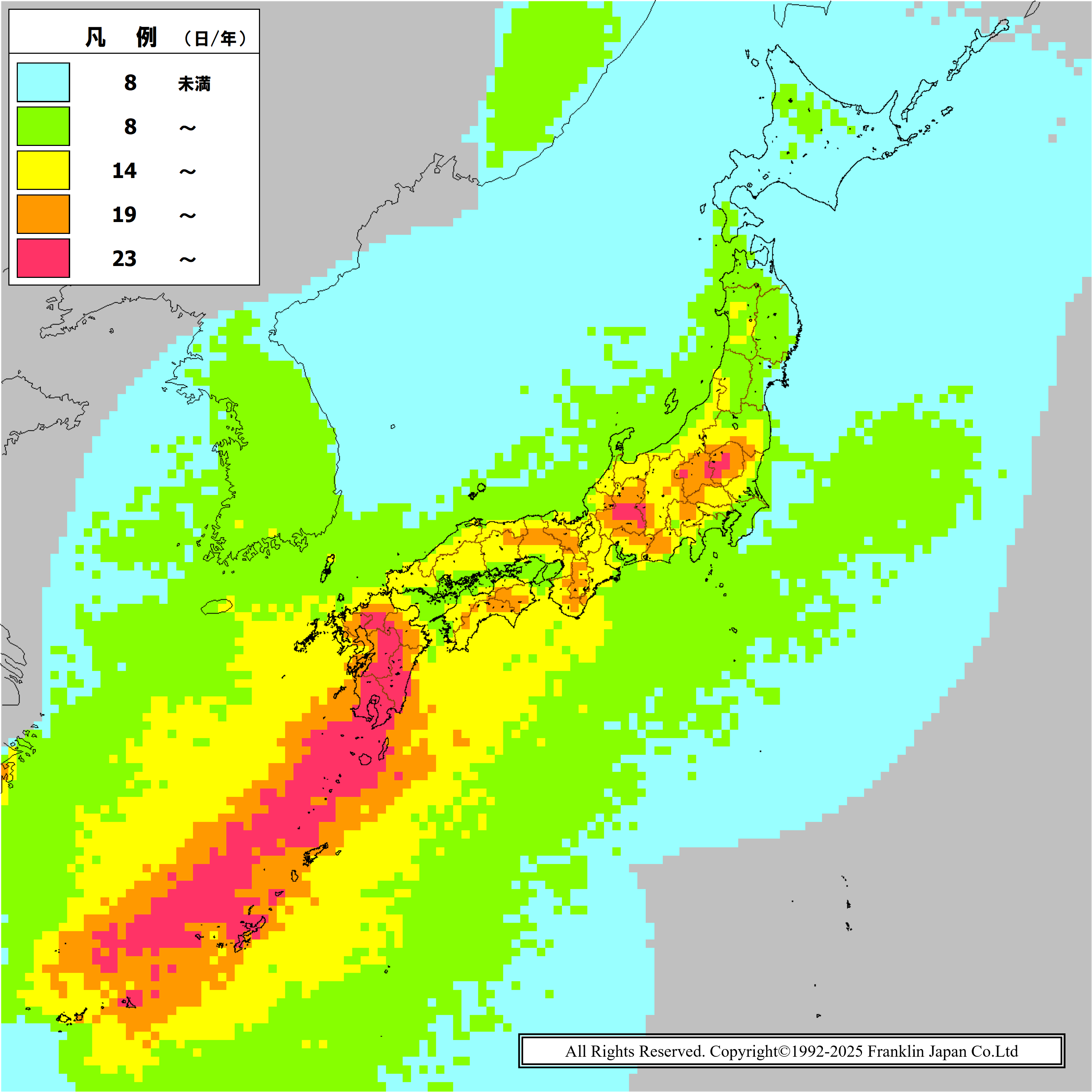 調査期間:2015年~2024年(4月~9月の10年間年平均) 単位:日/年 メッシュサイズ:20km四方