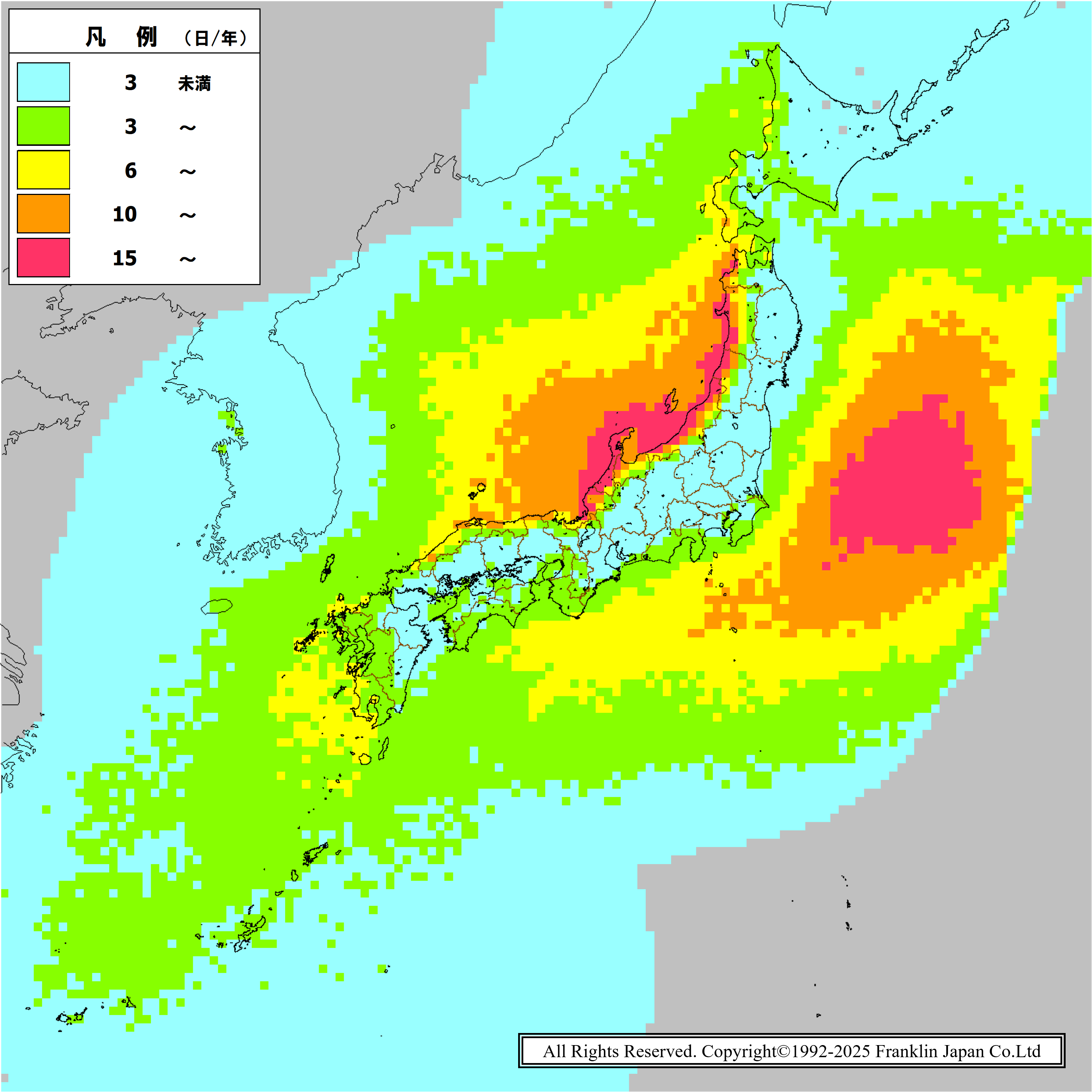図は日本列島を一辺20kmのメッシュで区切り、メッシュ内の落雷日数を最近10年間(10月~3月)の積算で集計して年平均値を算出し、色分けしたものです。陸上においては「東北~北陸の日本海側」が多いエリアとなっています。