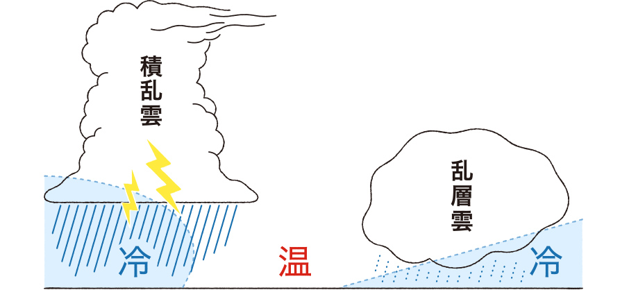 あたたかい空気(暖気)と冷たい空気(寒気)が接する前線付近では、暖気が寒気の上に乗り上げる(温暖前線)、または寒気が暖気の下に潜り込む(寒冷前線)ことによって、暖気が押し上げられて上昇気流が発生します。(前線性上昇気流)この上昇気流により発生する雷を界雷または前線雷といいます。通常、寒冷前線の方が温暖前線に比べて暖気を押し上げる力が強く働くため、雷が発生しやすくなります。
