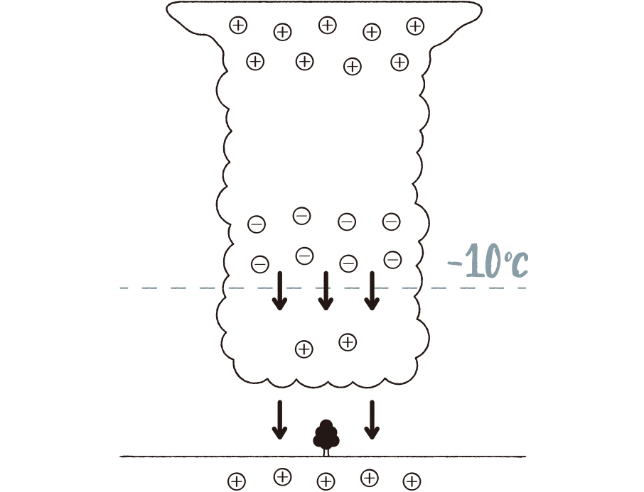 雷放電が起こる前の雲の中は、上層はプラス、-10℃以下の中層はマイナス、それより下層はプラスに帯電しています。
