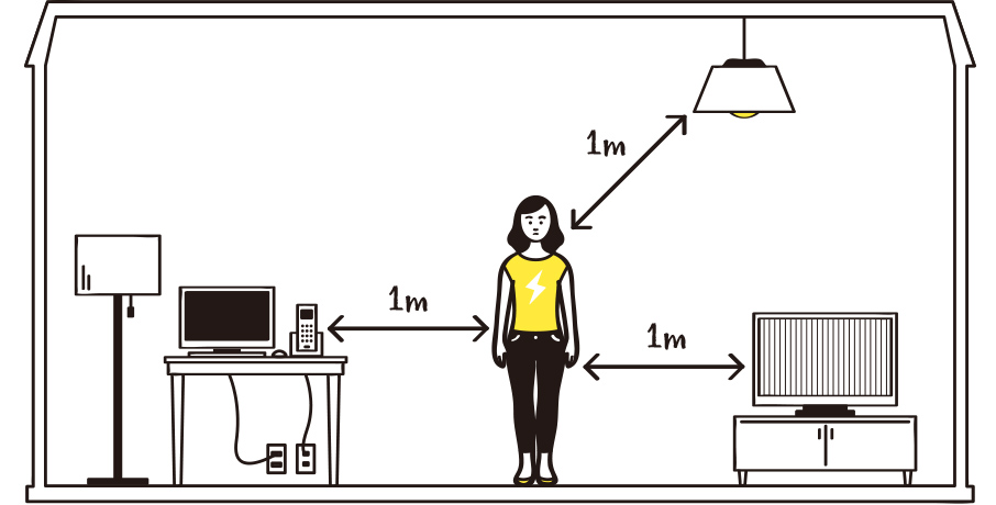 屋内は落雷に対し概ね安全な空間ですが、電話線や電源線、アンテナ線などは外部から屋内への雷の侵入ルートとなり得ます。実際に、これらに繋がる電化製品を経由して、人が感電する事故の例があります。落雷時に屋内へ避難した場合には、外部から建物に入るこれらの線に繋がる電気器具や、壁・柱などから1m以上離れるとよいでしょう。
