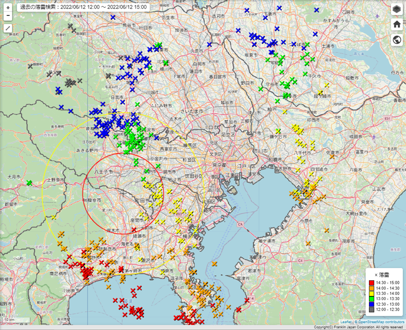 ※×印が一回の落雷を表し、落雷の発生した時間帯ごとに色分けがされています。