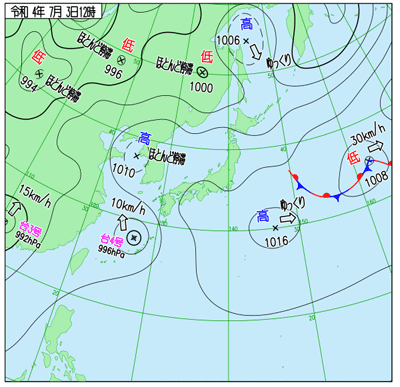 下図は、7月3日12時から7日18時にかけての天気図です。