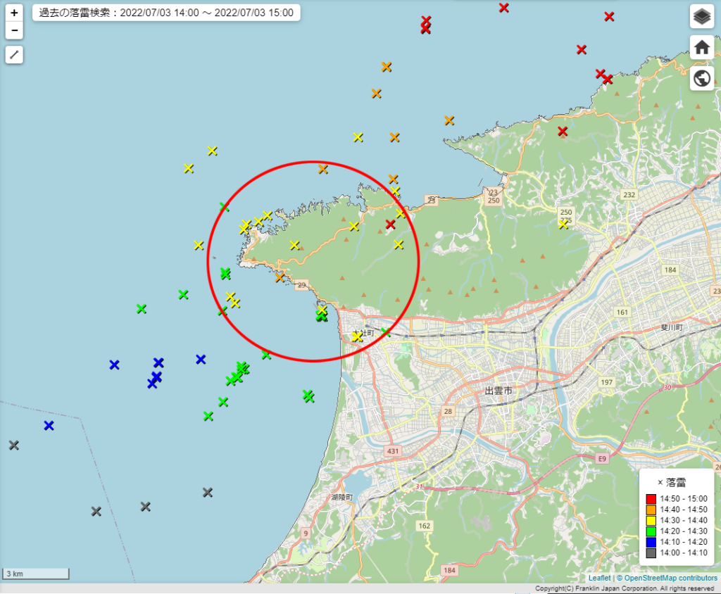 下図は、7月3日14時~15時の島根県出雲市付近の落雷の状況です。