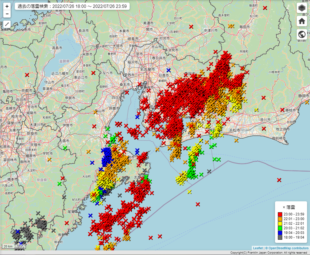 下図は、名古屋付近 7月26日23時50分頃の落雷状況です。(弊社Twitterより引用)