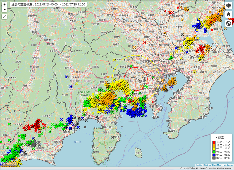 ※×印が一回の落雷を表し、落雷の発生した時間帯ごとに色分けがされています。
