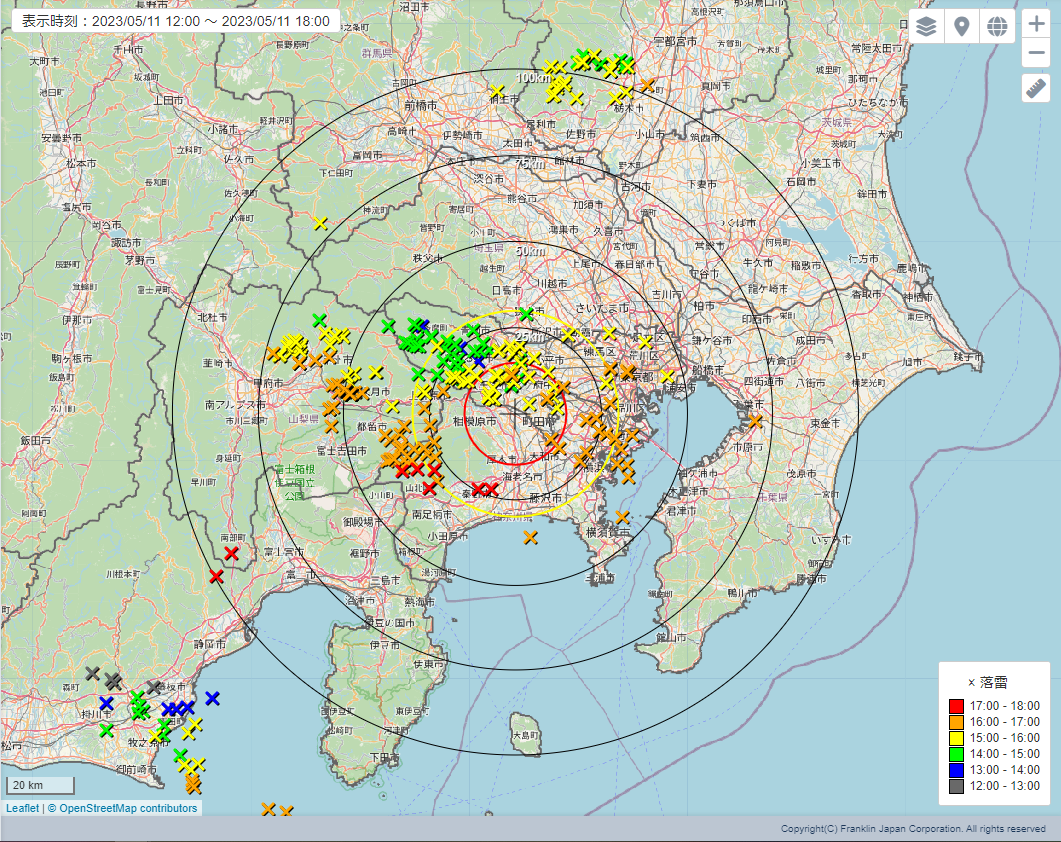下図は、首都圏 5月11日16時頃の落雷状況です。(弊社Twitterより引用)