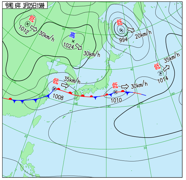 【2024年3月25日15時~3月26日18時 実況天気図(気象庁HPより)】