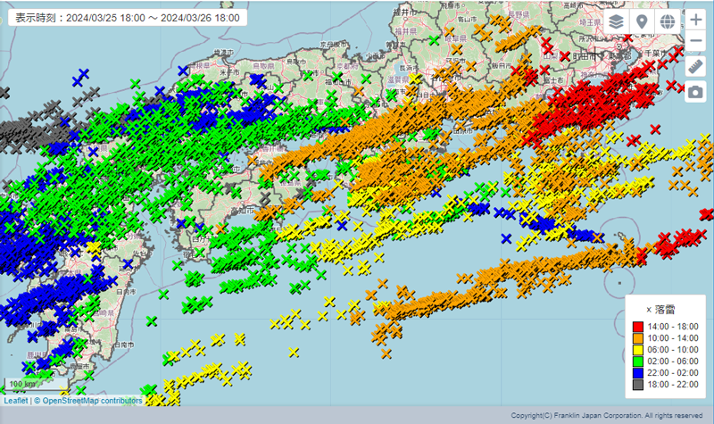 (フランクリン・ジャパンの雷観測システムJLDNの雷観測より)
