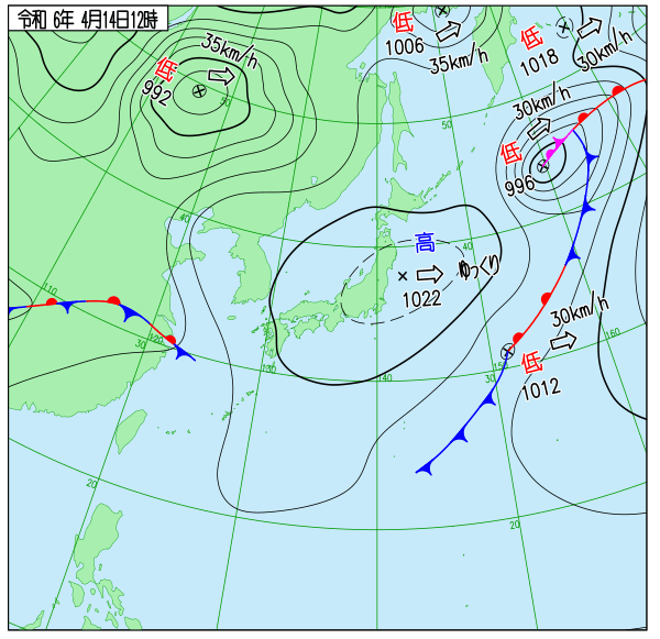 【2024年4月14日12時~4月15日18時 実況天気図(気象庁HPより)】