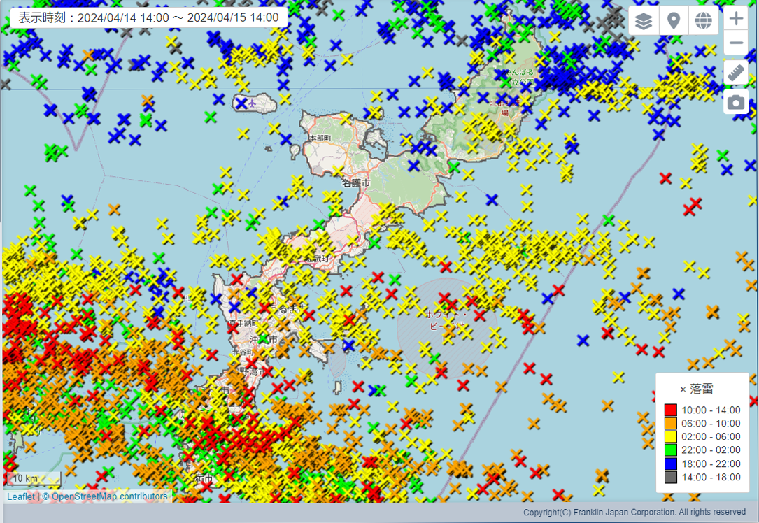 下図は、沖縄本島 4月14日5時頃の落雷状況です。(弊社Xより引用)