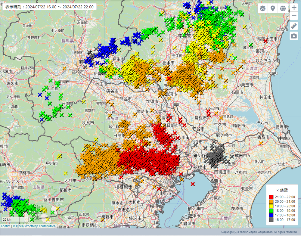 下図は、東京付近 7月22日20時45分頃の落雷状況です。(弊社Xより引用)