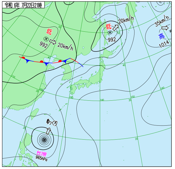 【2024年7月22日21時 実況天気図(気象庁HPより)】