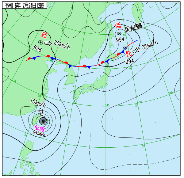 【2024年7月24日12時 実況天気図(気象庁HPより)】
