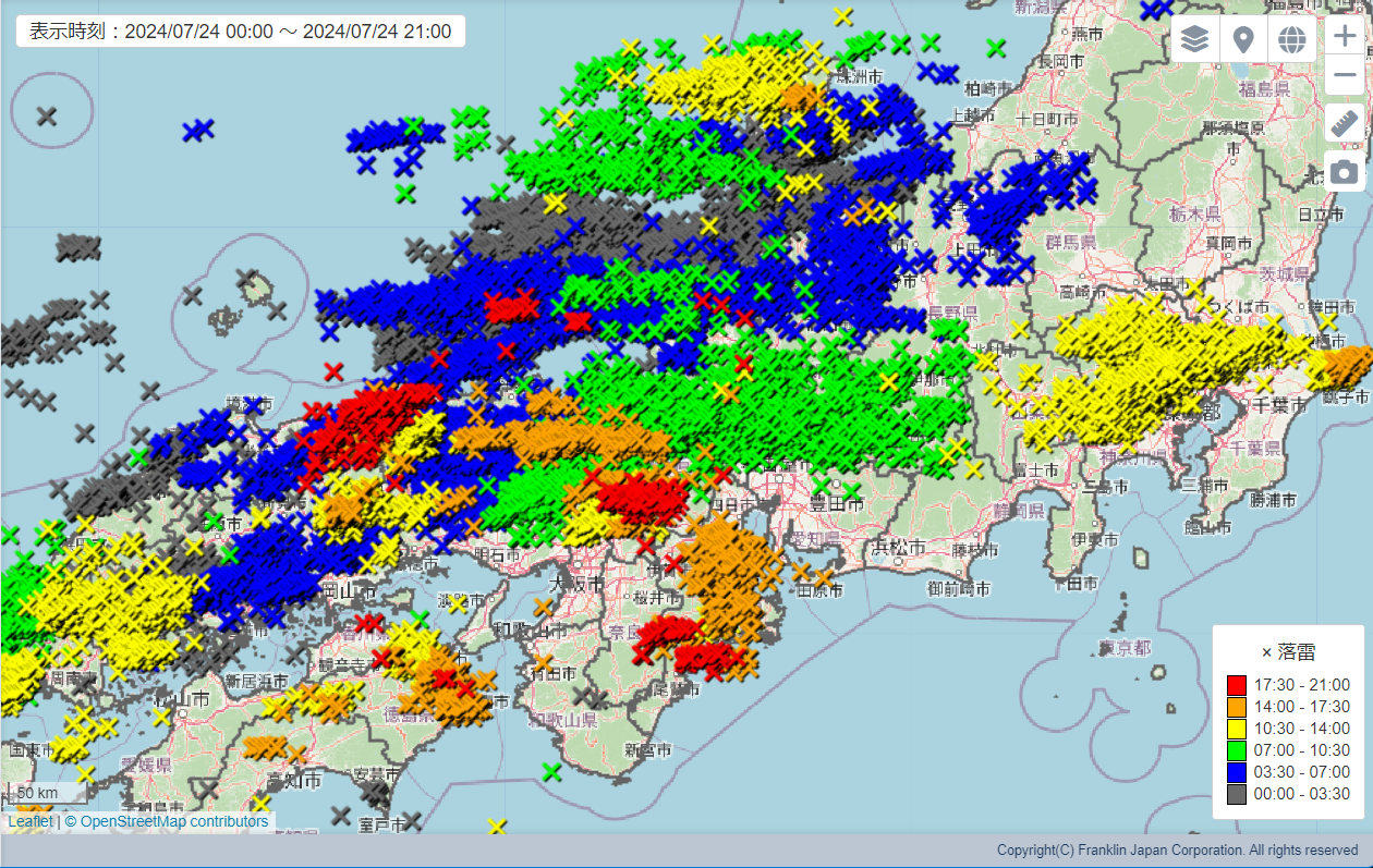 (フランクリン・ジャパンの雷観測システムJLDNの雷観測より)