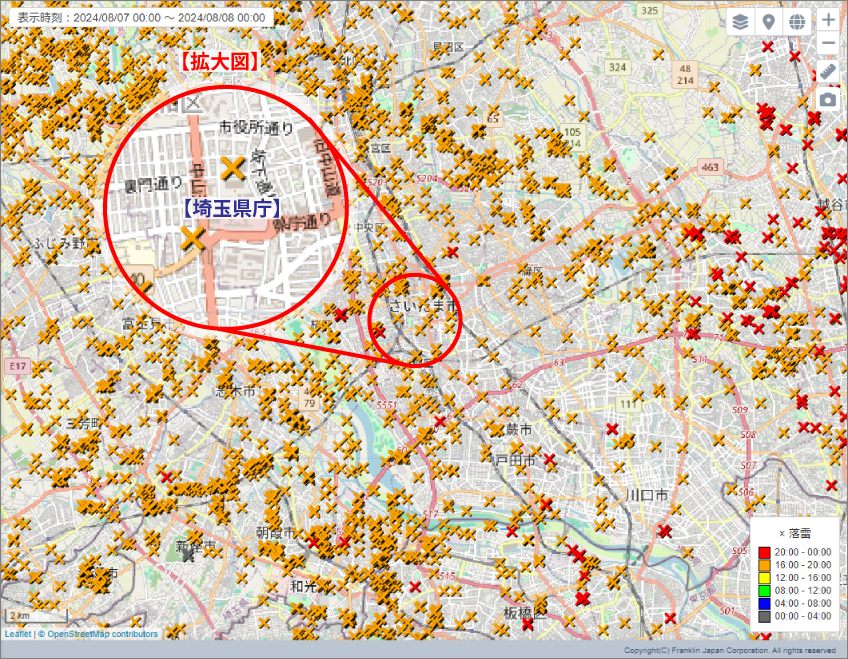 【2024年8月7日 埼玉県庁周辺 落雷状況図】