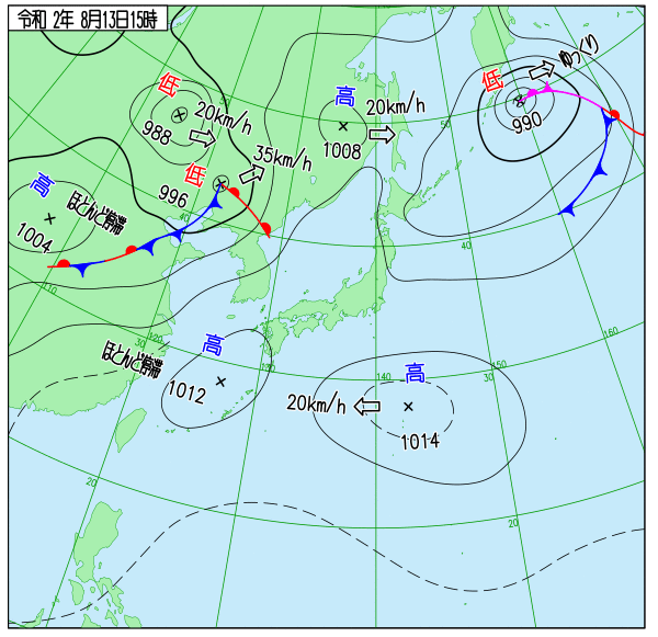 【2020年8月13日15時 実況天気図(気象庁HPより)】
