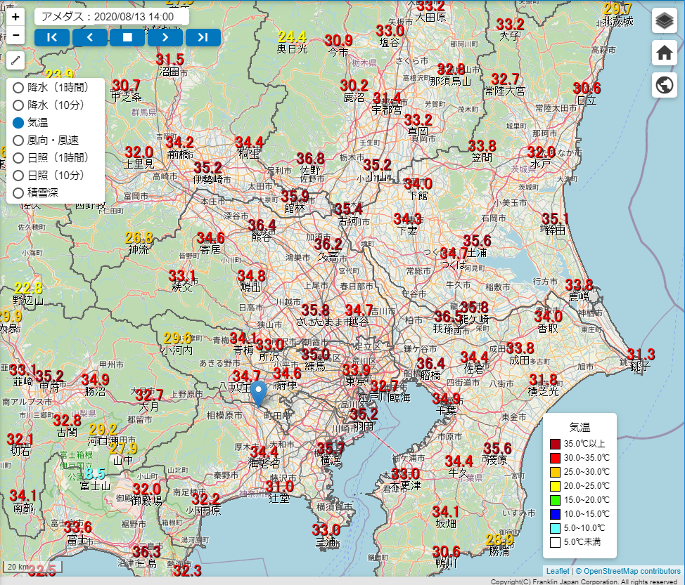 2020年8月13日、西日本から東日本は前日(12日)に引き続き高気圧に覆われて晴れて気温が上昇し、関東地方では午後から大気の状態が不安定になりました。