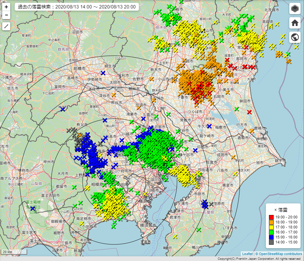 下図は8月13日14時〜20時までの関東地方の落雷の状況です。